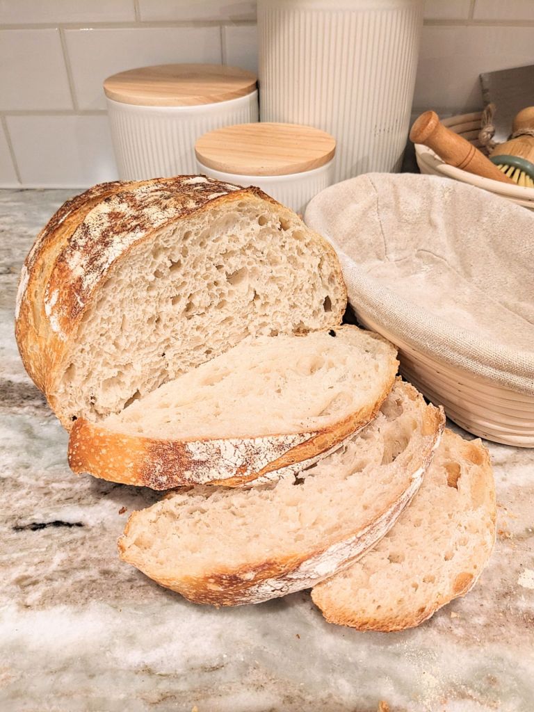 This is my recipe for fresh sourdough bread with a light airy crumb and a golden crunchy crust.