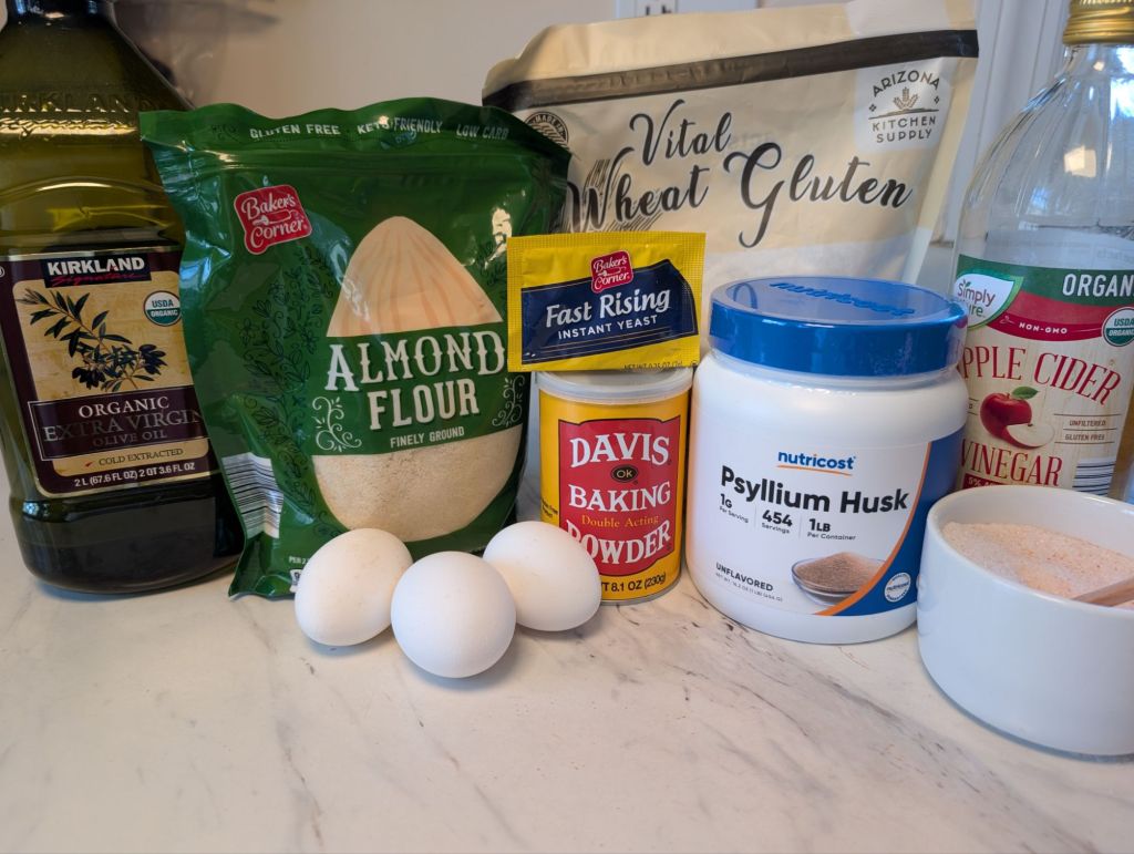 The base is superfine almond flour and vital wheat gluten — and the vital wheat gluten is the entire point. This is what commercial low carb breads use to get actual bread texture. At around 3g net carbs per two tablespoons it stays very keto friendly but it gives you genuine chew and structure that almond flour alone simply cannot deliver. Psyllium husk powder binds everything together, baking powder gives a little lift, and a teaspoon of instant yeast goes in dry. The yeast doesn’t do a huge amount of leavening here but what it does do is give you that authentic bready depth of flavour that low carb recipes almost always lack. It’s the difference between something that tastes like a bread substitute and something that just tastes like bread.
