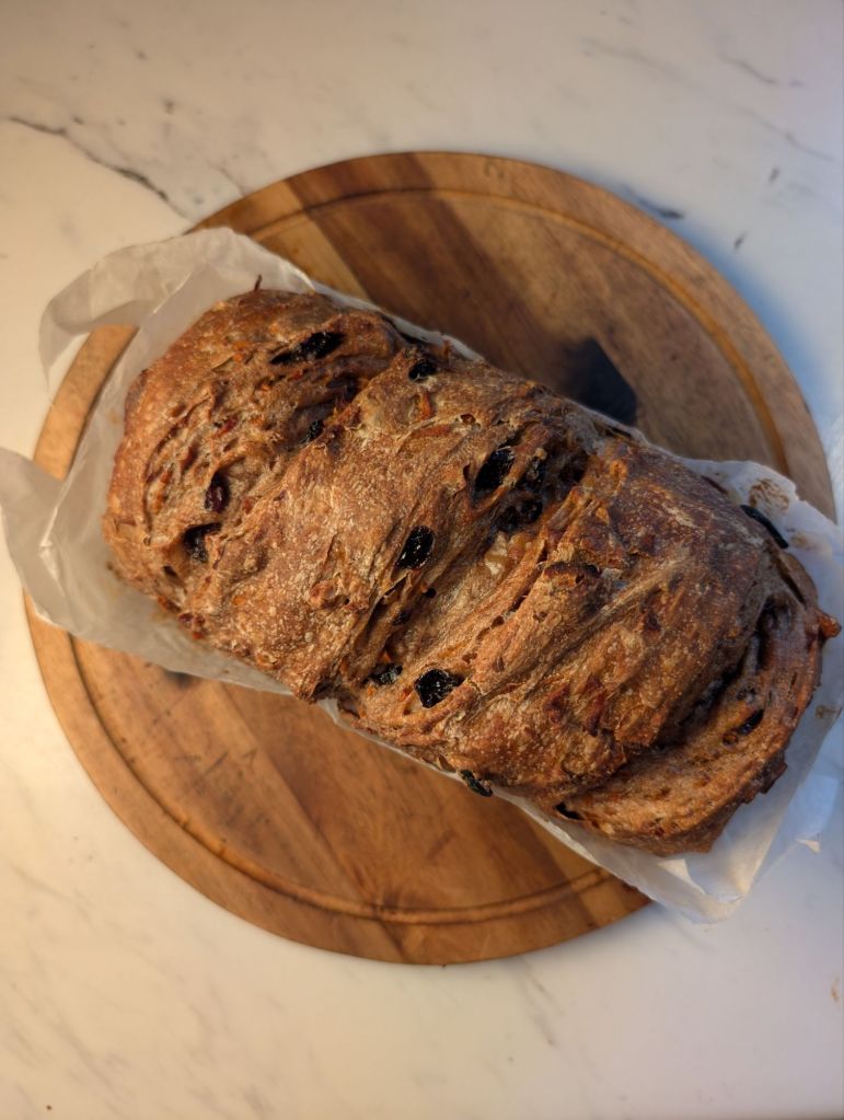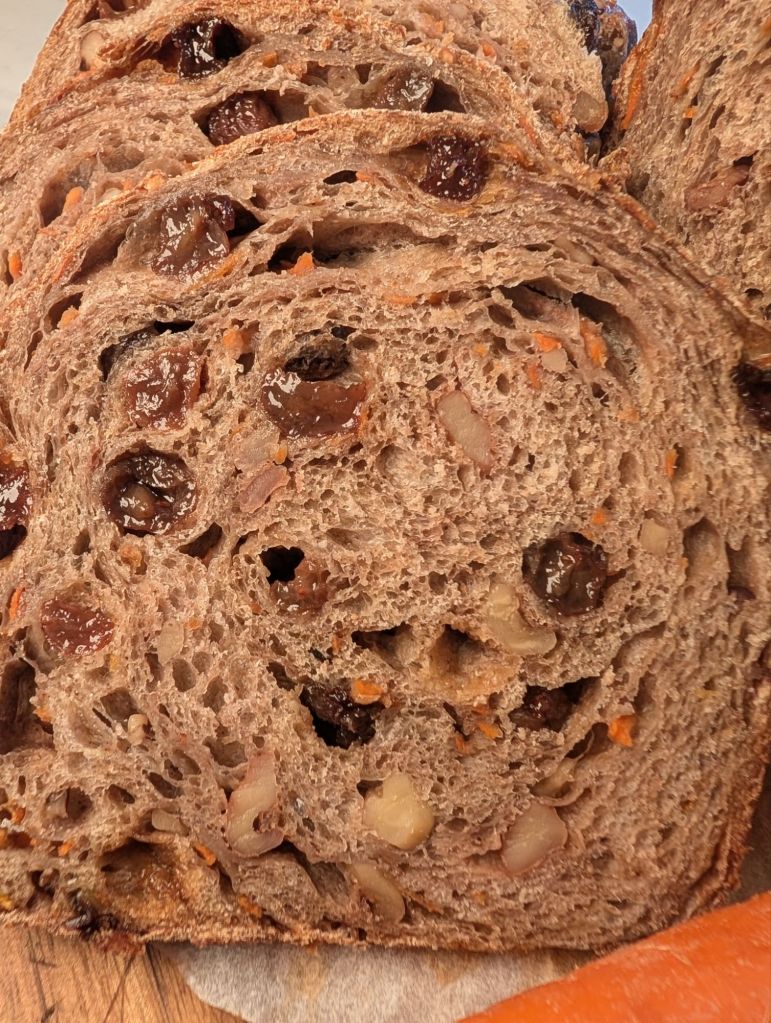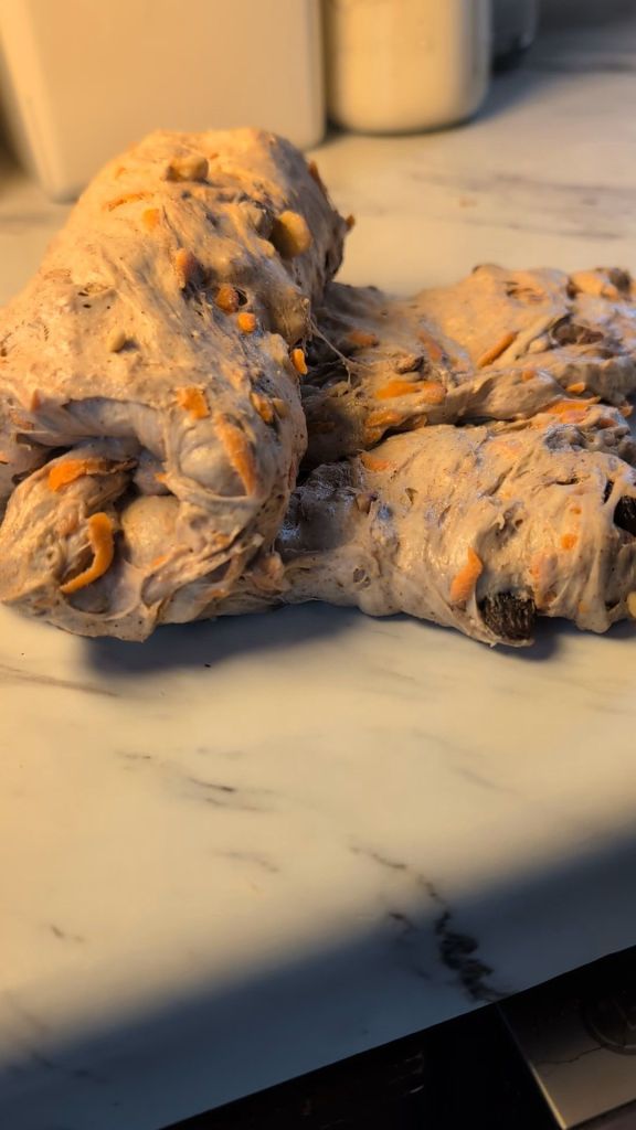 This is a dream loaf. I don’t say that about everything. The crumb is soft and loaded with carrot and nut and raisin pockets. The crust has this deep, spiced, slightly chocolatey note that hits you before you’ve even taken a bite. The cream cheese glaze on top makes it feel like an actual dessert that also happens to be sourdough. And the smell. I keep coming back to the smell. Your whole house will thank you.